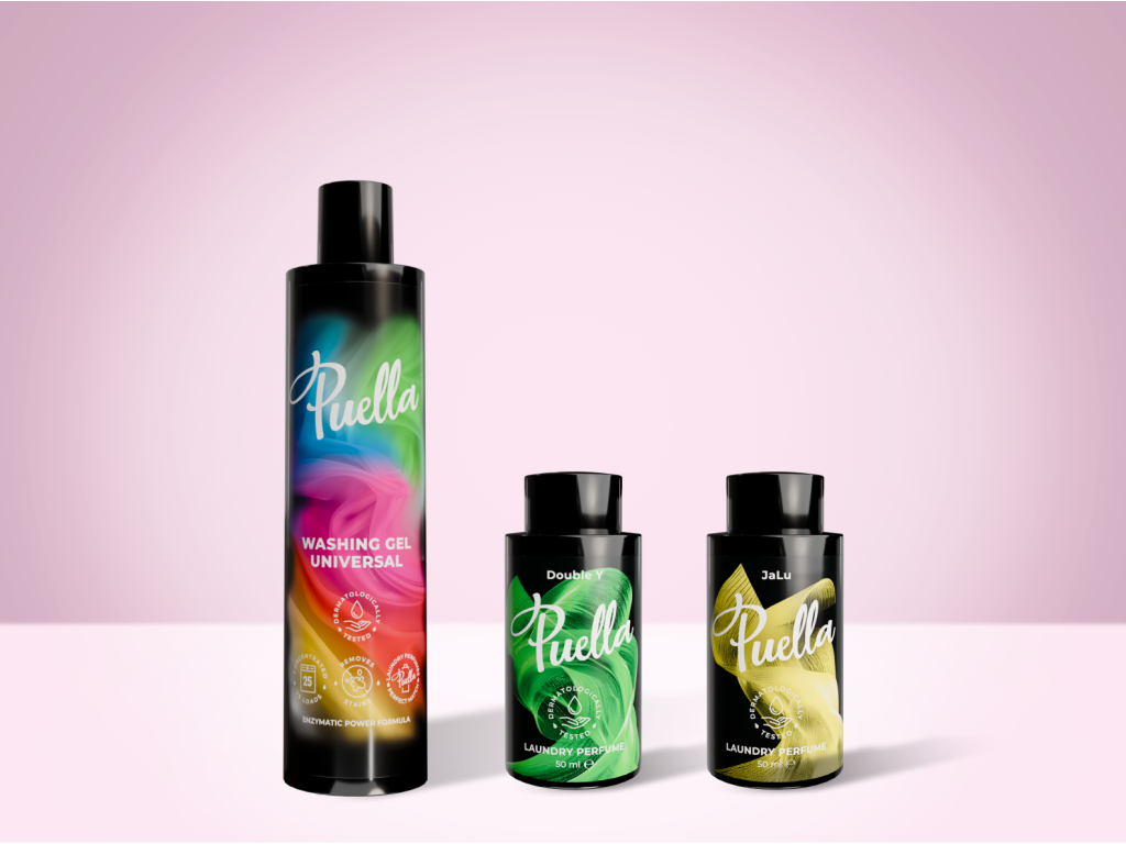 Questo set di prova contiene 250 ml di detersivo liquido universale Puella, 50 ml di profumatore per bucato Puella Double Y e 50 ml di profumatore per bucato Puella JaLu.