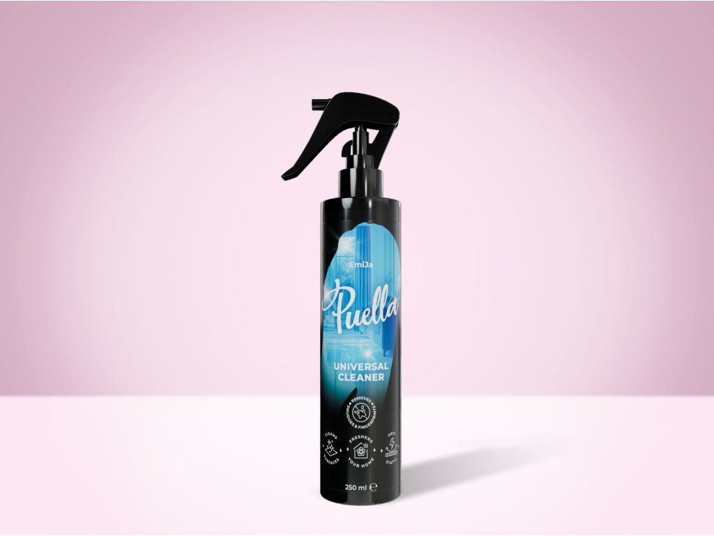 Puella spray detergente multiuso con profumazione EmiJa e pH bilanciato. Pulisce delicatamente ed efficacemente tutte le superfici, elimina polvere, aloni e impronte, profumando la vostra casa con il vostro profumo preferito.